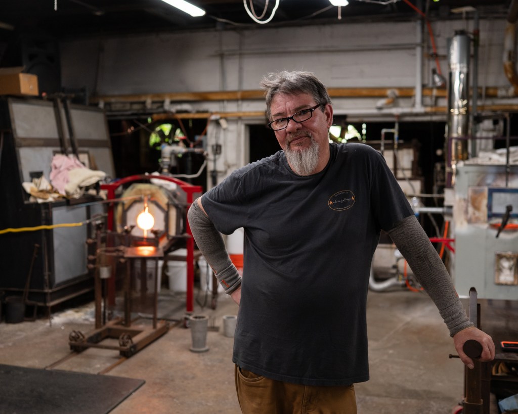 Glass artist Chris Johnson poses after making a glass blown vase in his studio on Wednesday, April 9th, 2025, in Davenport, California.