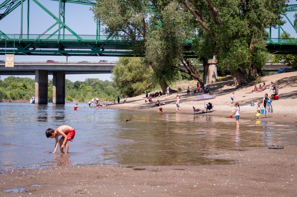 Beachgoers cool off at the American River during the year’s first heat wave in Sacramento, California, Saturday, May 10, 2025. Temperatures are expected to reach highs into the 90s.